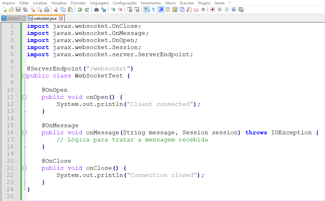 Aqui está um exemplo simplificado de como um servidor WebSocket pode ser implementado em Java EE: