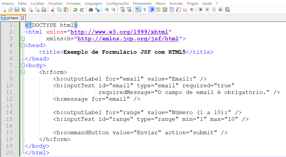 Aqui está um exemplo simplificado de um formulário web utilizando JSF com elementos HTML5: