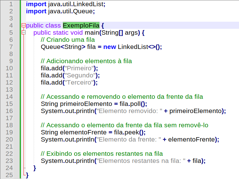 Este é apenas um exemplo básico de como trabalhar com filas em Java, e existem outras implementações e métodos disponíveis para manipulação de filas, dependendo das necessidades específicas do sistema.